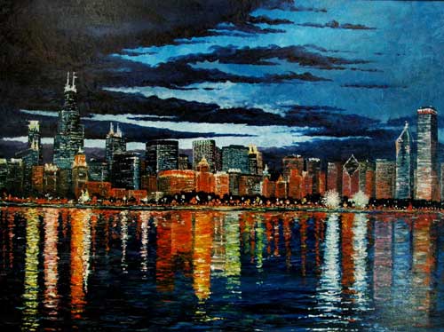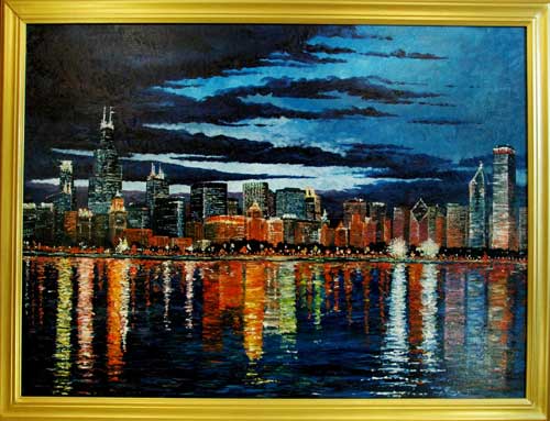 Title: Chicago at Dusk Medium: Oil on canvas Size Unframed: 48" x 36" Size Framed: 53" x 41" (gold paint over wood) Price Unframed: $2,995.00 Price Framed: $3,095.00 Giclee print on canvas: 48" x 36" (unframed) $600.00 Giclee print on canvas: 24" x 18" (unframed) $200.00
