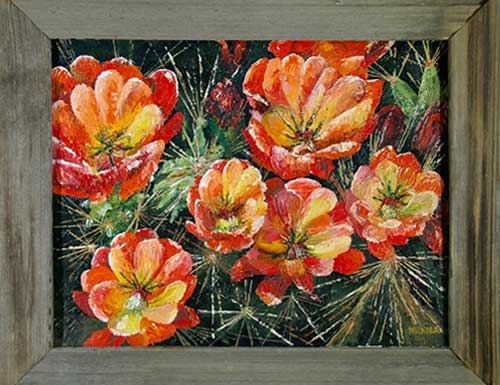 Title: Cholla Flowers 3 Medium: Oil on canvas Size Unframed: 20” x 16" Size Framed: 25 1/2” x 21 1/2” (grey barn wood) Price Unframed: $695.00 Price Framed: $745.00