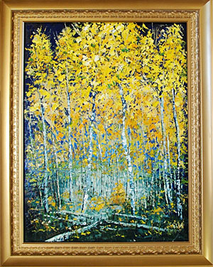Title: Aspens 2 Medium: Oil on canvas Size Unframed: 18” x 24" Size Framed: 24” x 30” (gold paint over wood) Price Unframed: $895.00 Price Framed: $975.00 Giclee print on canvas: $200.00