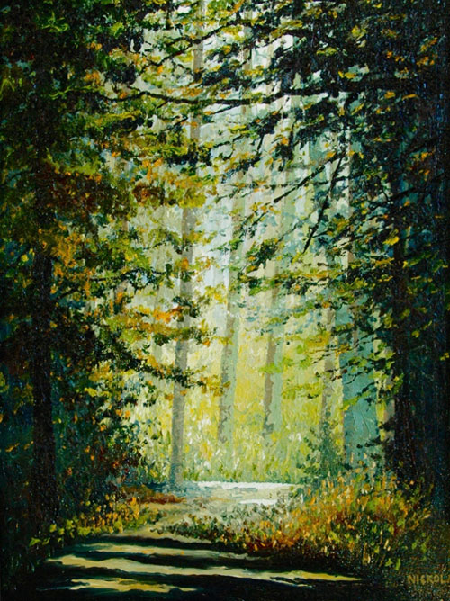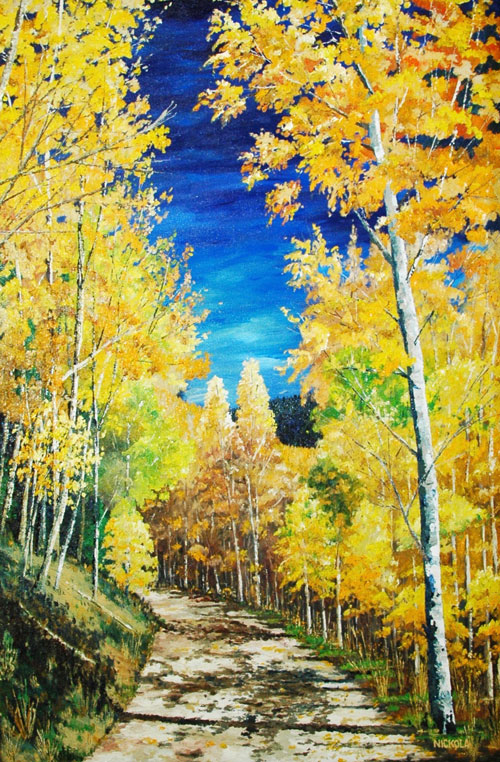 My escape subject matter; whether getting lost in the golden hues of aspen trees in the fall, or a walking through a hypothetical forest, provides endless opportunities to explore color, contrast, light, and texture. These paintings provide no boundaries for my imagination. For me, these paintings are simply fun.