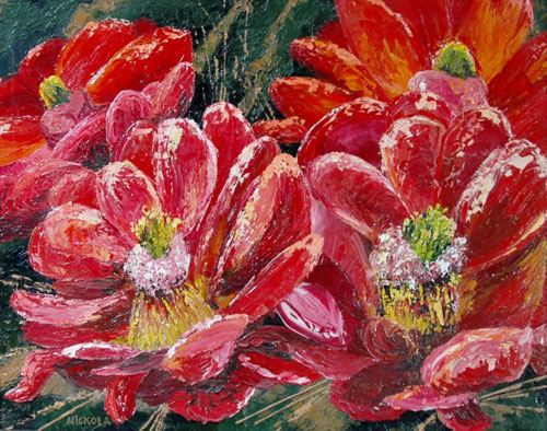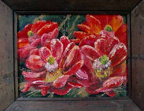 Title: Cholla Flowers 2 Medium: Oil on canvas Size Unframed: 20” x 16” Size Framed: 25 1/2” x 21 1/2” (dark brown barn wood) Price Unframed: $695.00 Price Framed: $745.00