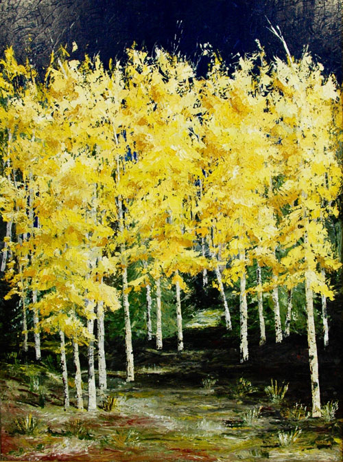 My escape subject matter; whether getting lost in the golden hues of aspen trees in the fall, or a walking through a hypothetical forest, provides endless opportunities to explore color, contrast, light, and texture. These paintings provide no boundaries for my imagination. For me, these paintings are simply fun.